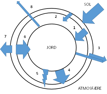 - Stråling fra solen reflektert fra skyer + jord 100 W/m² dvs 30%